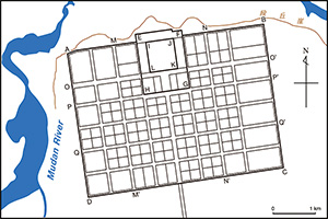 Shangjing Longquanfu, the capital of the Bohai State, was located at today’s Dongjingcheng near Ning’an, Heilongjiang Province of China. It is known that the ruins of the capital hold the features shared by East Asian ancient cities, namely the rectangular shape, grid patterns for streets, outstanding width of the main street, and location of the palace site in the center of the city’s north side. The above satellite photograph shows these features very clearly, indicating that Shangjing was planned in the typical style of 8th century East Asia.